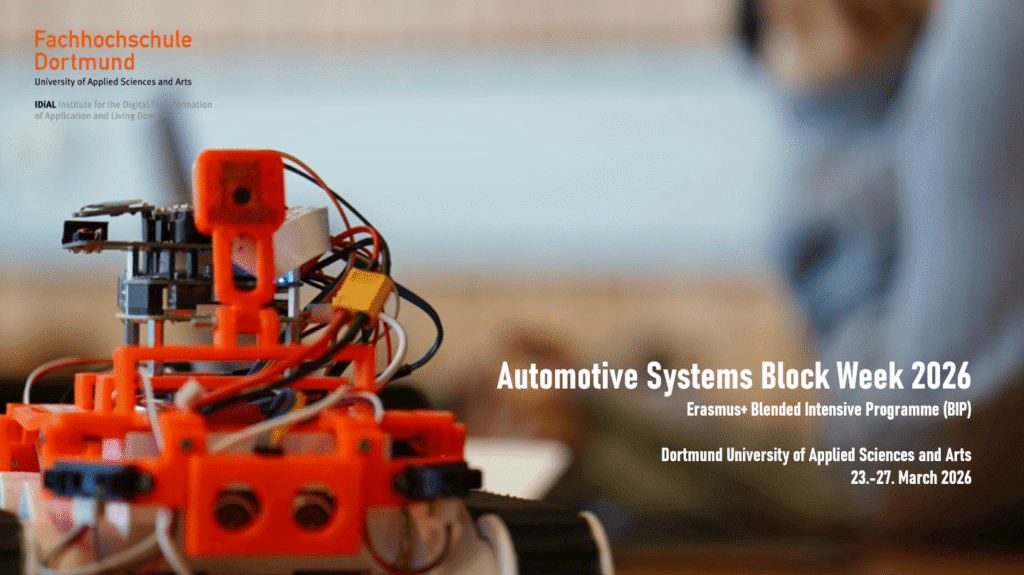 Time frame: The BIP Automotive Systems Block Week 2026, organised by the University of Applied Sciences Dortmundspans over four consecutive calendar weeks (CWs). It starts with a virtual phase (CW 11), followed by a presence phase of one week (block week CW 13 from 23rd to 27th of March ) and a virtual phase (CW 14)